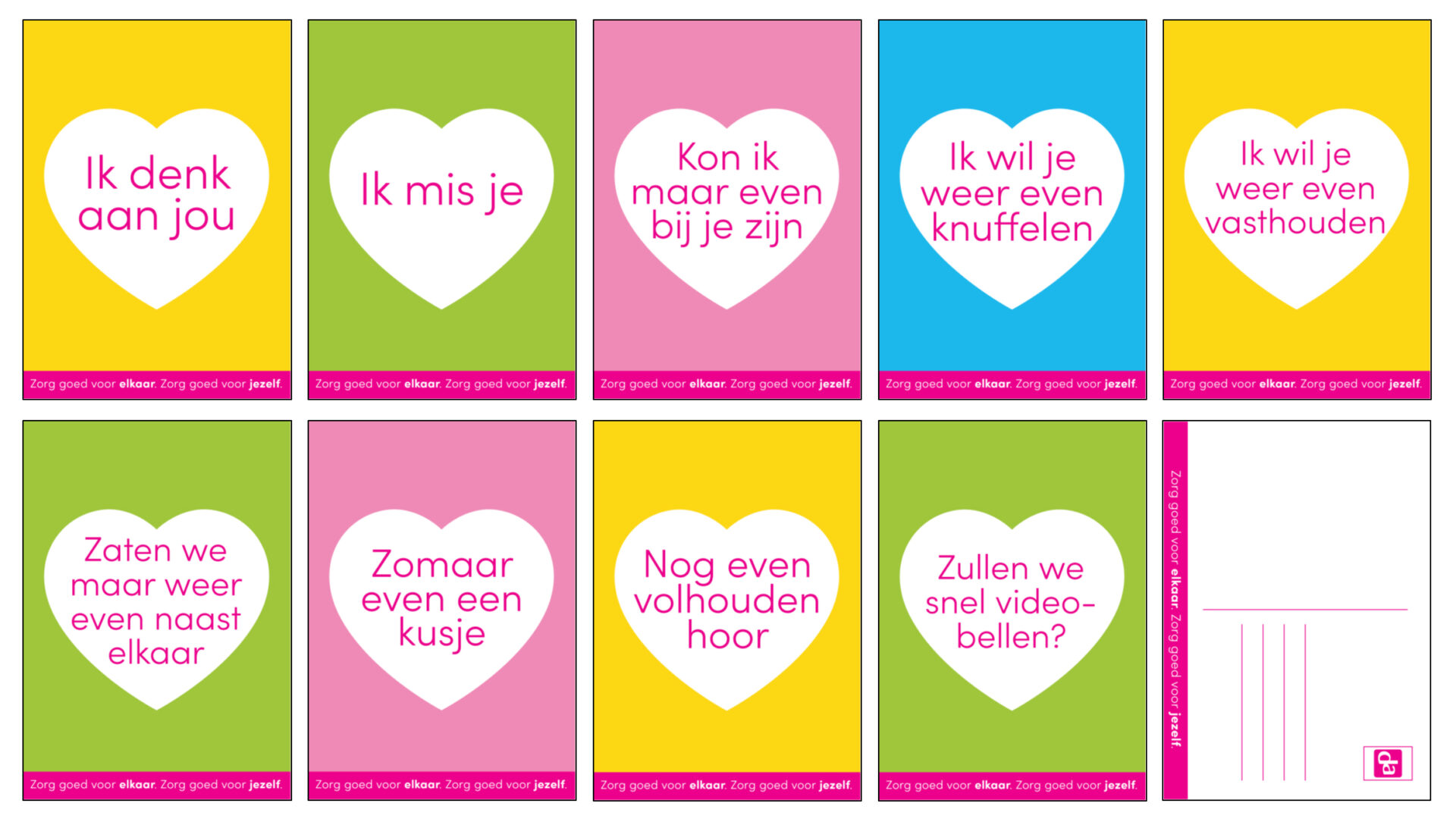 Er zijn 9 verschillende kaarten ontwikkeld die aan de winkels worden uitgeleverd. “Bij deze kaarten zit ook een A4-kaart”, zegt Van Orden. “Deze kun je in een standaard bij de kaarten plaatsen zodat het de klanten ook duidelijk is dat ze de kaarten gratis mee naar huis mogen nemen. Klanten kunnen de kaarten vervolgens zelf beschrijven en zelf op de post doen.”