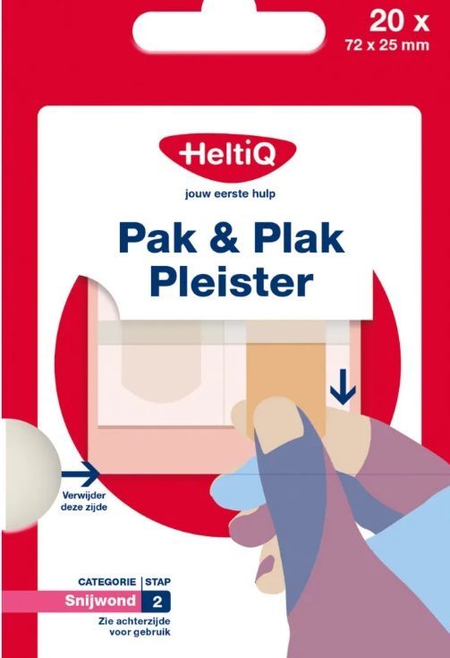 Met de HeltiQ Pak & Plak Pleister heb je in drie eenvoudige stappen snel en hygiënisch een pleister op de wond geplakt, met slechts één hand. De pleisters zitten op een handige kaart met twee rijen en het verwijderen van de folie en het plakken van de pleister gaat zonder het wondkussen aan te raken. Zo hoef je niet te zoeken naar een losse pleister in je verbanddoos of -tas.