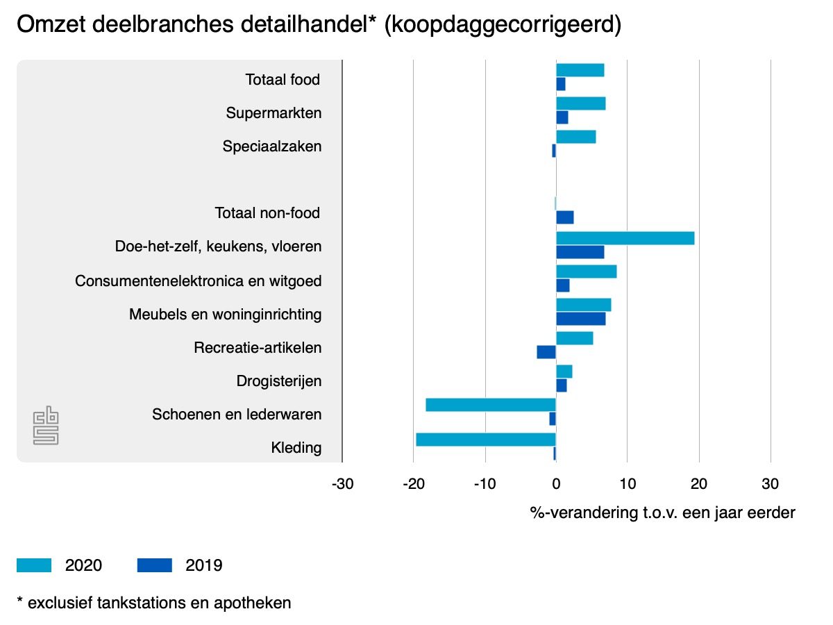 Hoewel de omzet over de hele detailhandel gerekend bijna 6% is, zijn door de maatregelen tegen de verspreiding van corona de verschillen binnen de detailhandel bijzonder groot. De foodsector zette 6,9 procent meer om, en ook de winkels in doe-het-zelfartikelen, keukens en vloeren, de winkels in consumentenelektronica en witgoed, de winkels in meubels en woninginrichting en de winkels in recreatie-artikelen hebben recordomzetten geboekt. De omzet van de non-foodsector bleef nagenoeg hetzelfde. Daarentegen kampten de winkels in kleding en de winkels in schoenen en lederwaren met zware verliezen, onder meer door de winkelsluitingen in het voorjaar en december.